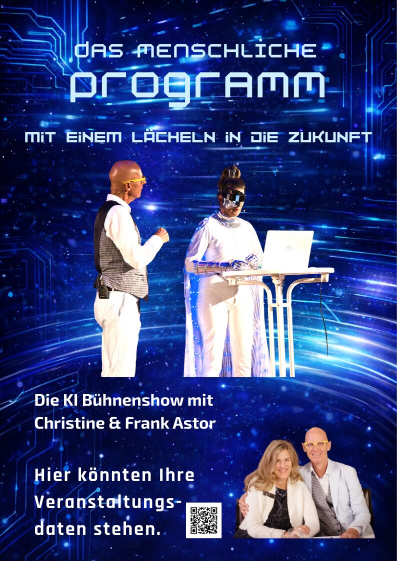 In ihrer Bühnenshow „Das menschliche Programm“ erkunden Christine & Frank Astor, warum Ethik und KI immer Hand in Hand gehen müssen. Und zeigen, wie das gelingen kann. Außerdem geben sie spannende Antworten auf die Fragen: